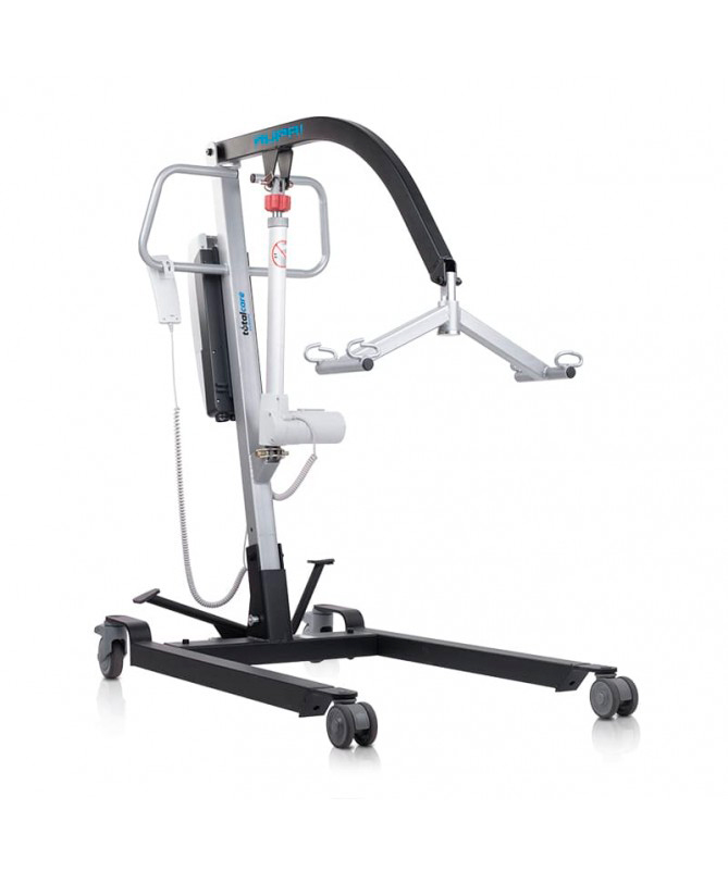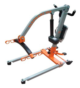 - Grúas de traslado Hop E- 150: tienen un ancho de patas desplegadas 76 cm, ancho total sin desplegar 54 cm. y longitud de 95 cm, peso de la grúa 29 kg, alto total 130 cm se suministran con el arnés, rango de elevación 39 cm a 157 cm, peso máximo 150 kg.