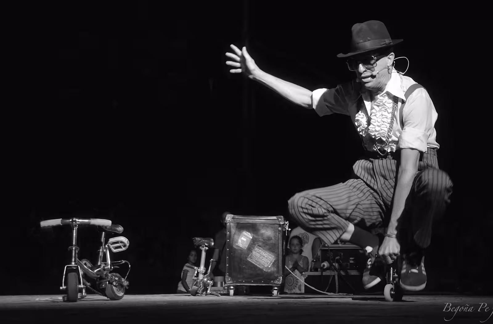 Karoli L'home roda” Un personatge incombustible. Combina enginy amb la presentació d’artilugis amb rodes, monocicles alts amb cames, bicis nanes de 10, 20 i 30 cms.