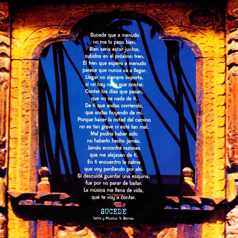 Sucede que a menudo no me lo paso bien. Bien sería estar juntos, subidos en el próximo tren. El tren que espero a menudo parece que nunca va a llegar. Llegar no siempre importa, si no hay nada que contar. Contar los días que pasan, que no se nada de ti. De ti que andas corriendo, que andas huyendo de mí. Porque hacer la mitad del camino no es tan grave ni está tan mal. Mal podría haber sido no haberlo echo jamás. Jamás encontré razones que me alejasen de ti. en ti encuentro la calma que voy perdiendo por ahí. Si descuidé guardar una esquina fue por no dejar de bailar. La música me llena de vida, que te voy a contar.