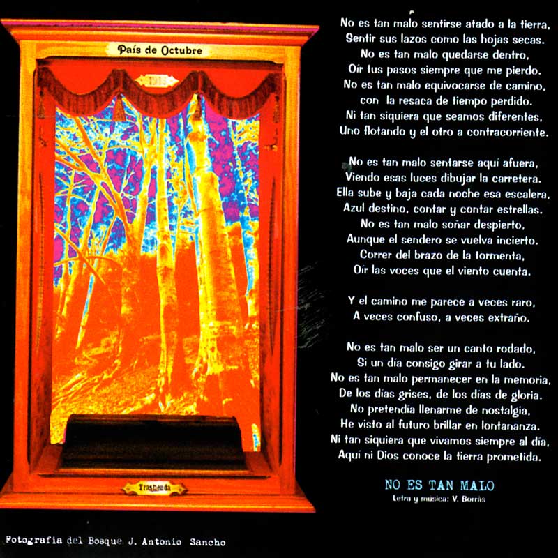 Nunca estuve mucho tiempo en cualquier parte, nunca sabré porque vuelvo a equivocarme. No pensaba detenerme a este lado del camino, sabiendome pobre, sabiendome rico. Se que jamas podre cruzar el mismo río, ni desandar este camino que he escogido. Disculpa, hablaba a favor del silencio. ¿Acaso se porque mi cuarto esta vacío? Parece que llego la hora del desencanto, ella se fue y me ha dolido tanto. Y es inútil esconderme de la implacable colera, que azota mi recuerdo, que inunda mi memoria.¿Dime quén maneja los hilos del escenario? ¿Dime quién se lleva las hojas del calendario? De los restos del naufragio, tan sólo cortinas de humo, de mis sueños de ceniza que el viento dispuso. Luego al acostarme tengo frío, pues ya nada es como había imaginado. ¿Ácaso tendré siempre un otoño infinito? ¿Àcaso estarás siempre donde miro?
